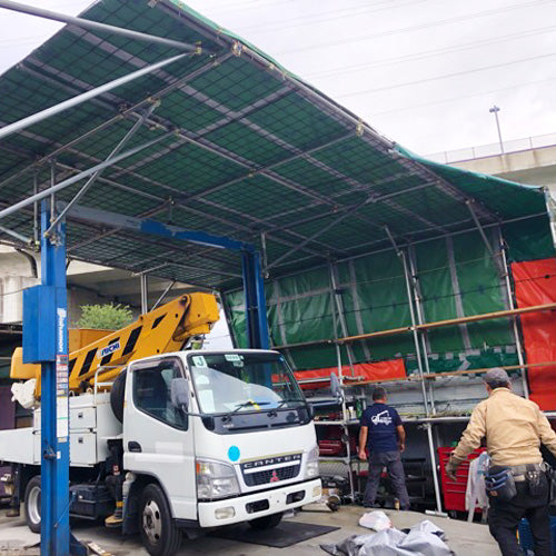 作業場用の屋根に設置する雨よけ・日よけカバーを製作いたしました。トラックシートに広く使用されているエステル帆布6号は、高強度で防水加工も施されているため屋根に設置して日差しや雨を遮る用途にも適しています。オーダーメイドで大型サイズのシートを製作し、固定用の三角ピケットを15か所加工しています。カバーを天井屋根に取り付けることにより、天候に関わらず作業を進めることができるスペースを確保できます。