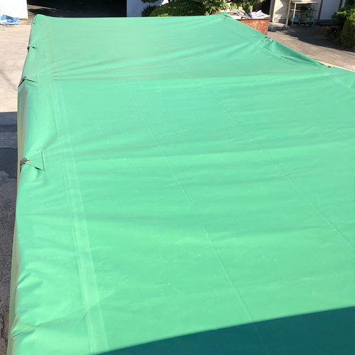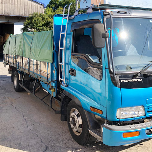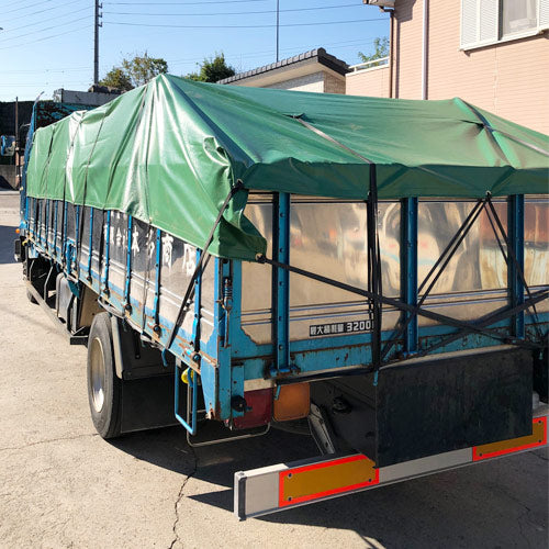 中型トラック用のシートを製作いたしました。荷台に積まれた金属は雨に濡れると錆びる原因になりますが、防水性のあるトラックシートを使用しすることで品質を変えることなく運搬できます。オーダーメイドで荷台のサイズにぴったり合っており、さらに三角ピケット加工を施しゴムロープを通すことでバタつきを防ぎ、しっかりと固定されます。平ボディのトラックで建材・工具・金属製品などを安全に運ぶには、オリジナルサイズのトラックシートがおすすめです。