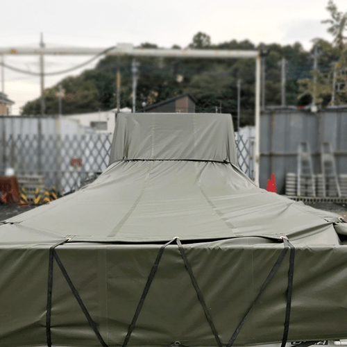 エステル帆布6号(OD)を使用し、中型トラックの荷台用トラックシートを製作いたしました。運転席の後ろに位置する鳥居部分を覆えるよう、リア部よりフロント部が長い台形のシートです。シートのバタツキをおさえられるよう、両サイドに4ヶ所、リア部に1ヶ所帯ピケットを追加しているため、固定用の輪ゴムロープでトラックシート全体をしっかりと固定することができます。ハトメ加工もしていますので、帯ピケット加工と合わせてシートの固定にご利用いただけます。
