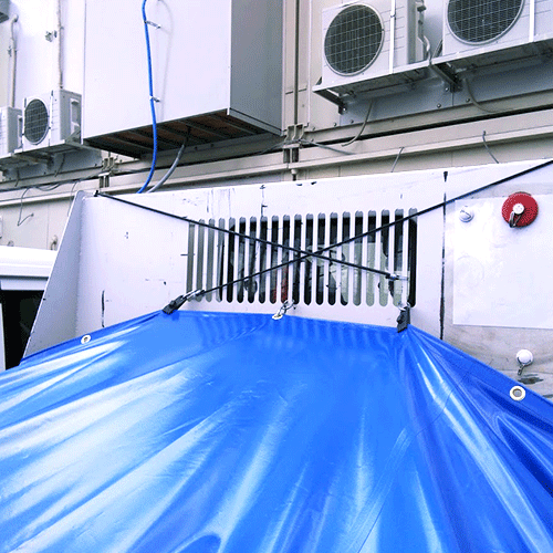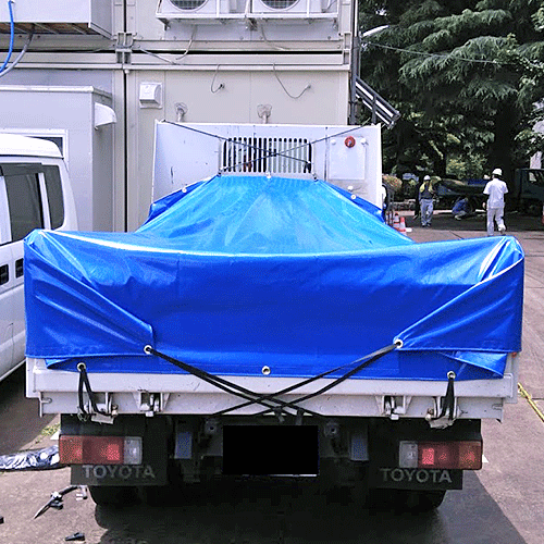 採用したウルトラマックスは、生地表面にフッ素コート、裏面にはアクリル加工を施した防水性・防汚機能と、高UVカット(紫外線99%カット)機能があり、耐久性・耐候性に優れた生地です。生地は厚手ですが、荷台にカバーしやすい柔軟性がありますのでトラックシートには最適な素材です。