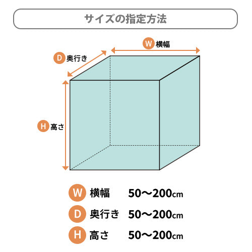 標準仕様は、箱型5面体でシートの継ぎ目が織り返し裁縫となっています。1つ1つ職人の手で裁縫されていますので、丈夫で水の侵入などをしっかりと防ぎます。 横幅(W)×奥行き(D)×高さ(H)のサイズをご指定いただけます。