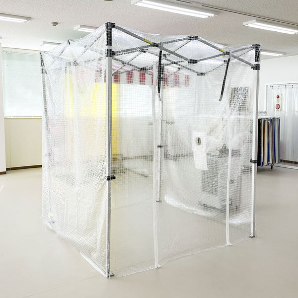 天井が高くない工場でも設置しやすい1.8mx1.8mのサイズで、設置場所を移動したい場合も折りたたんで簡単に運搬できます。