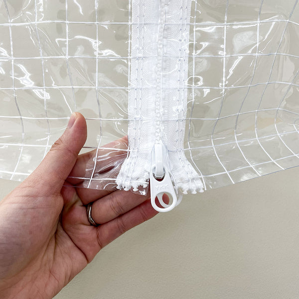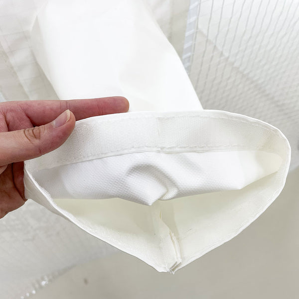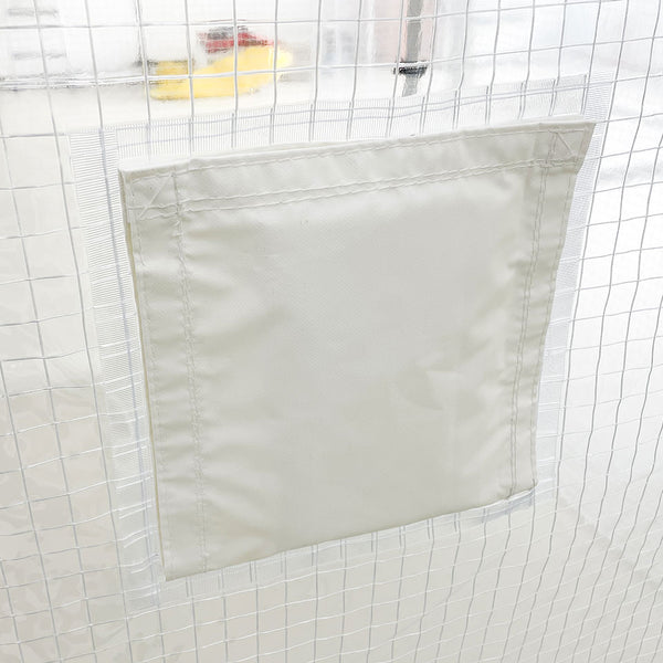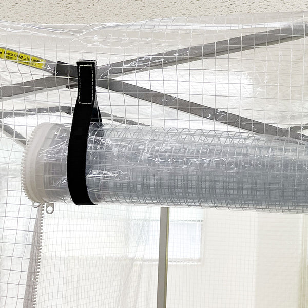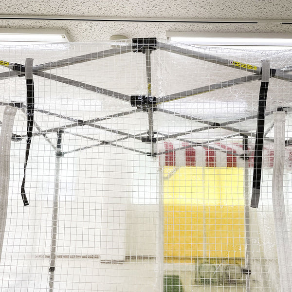 本体の糸入り透明ビニールシート、通風口のターポリン生地はどちらも防炎タイプです。