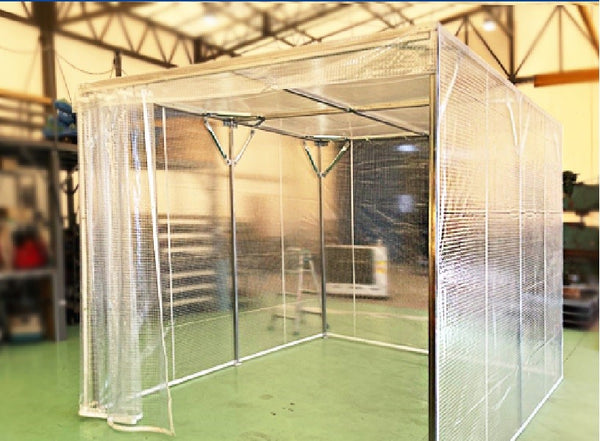 空間・区画の間仕切り、ホコリ除け、塗装ブース、作業ブースなどに最適で、様々な環境でご利⽤いただけます。DIYで組⽴て可能なフレームを採⽤し、業務利⽤に安⼼で最適の防炎ビニールシートもセットになっています。出⼊⼝はビニールカーテン仕様で、奥⾏きは2m〜5mまで選べ、簡易ブースとして使⽤可能です。