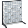 ●間口(mm):900●奥行(mm):430●高さ(mm):985●最大積載量(kg/台):60●棚段数(段):6●色:ホワイト(棚板・底板)、ダークグレー(支柱、ベース、上棧)●ポケット数(個):48●組立目安:1人30分