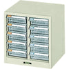 ●間口(mm):243●奥行(mm):237●高さ(mm):253●最大積載量(kg/台):15●引出し:浅5段×2列●本体色:アイボリー、引出し色:透明●引出し内寸(mm)間口×奥行×高さ:89×206×36●仕切板(枚):20