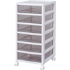 ●引き出しの材質にスチロールを採用しているため透明度が高く、中身が確認しやすいクリアタイプのチェストです。●引き出しは飛び出しにくい、簡易ロック構造です。●移動に便利なキャスター付です