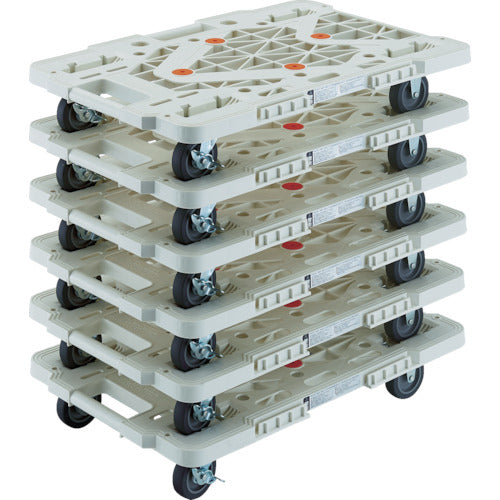 ●6台セットのお買い得品です。●メッシュ構造の採用で、従来品よりさらに軽量で移動が簡単です。●縦・横方向に連結が可能です。(縦連結はオール自在キャスター仕様、オール自在ストッパー付キャスター仕様のみ)●スタッキング可能です。●荷台は堅牢なメッシュリブ構造です。●薬品や溶剤にも侵されにくく耐久性に優れています。●台上に滑り止め用ゴムが4ヵ所ついています。●エラストマー樹脂車輪の採用でタイヤ痕がつくのを軽減します。●ルートバンMP-600用コーナーストッパーの取り付けが可能です。(MPK-600シリーズ)