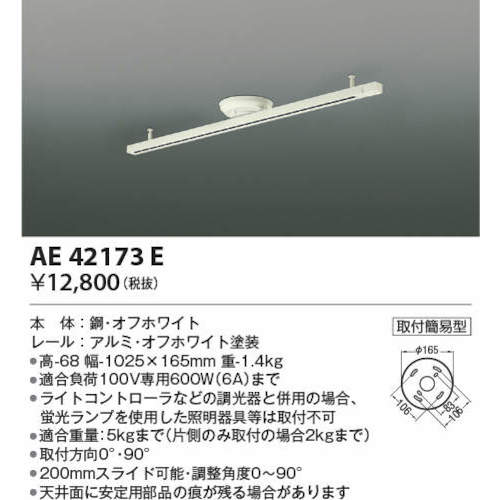 ●適合負荷100V専用600W(6A)まで●適合重量:5kgまで(片側のみ取付の場合2kgまで)●取付方向0°・90°●300mmスライド可能・調整角度0〜90°●200mmスライド可能・調整角度0〜90°●天井面に安定用部品の痕が残る場合があります