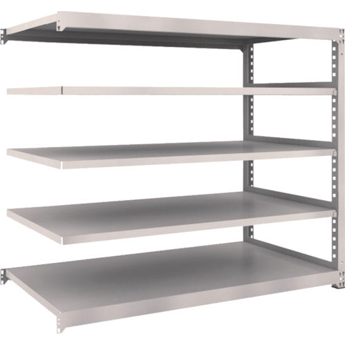 ●間口(mm):1800●奥行(mm):931●高さ(mm):1511●有効間口(mm):1740●色:ネオグレー●棚段数(段):5●均等積載量(kg/段):300●最大積載量(kg/台):2500●棚板調整ピッチ(mm):25●タイプ:連結型●組立目安:2人30分