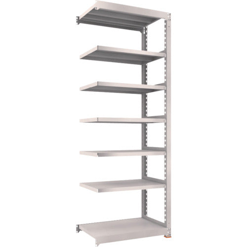 ●間口(mm):900●奥行(mm):581●高さ(mm):2411●有効間口(mm):840●色:ネオグレー●棚段数(段):7●均等積載量(kg/段):500●最大積載量(kg/台):2500●棚板調整ピッチ(mm):25●タイプ:連結型●組立目安:2人30分
