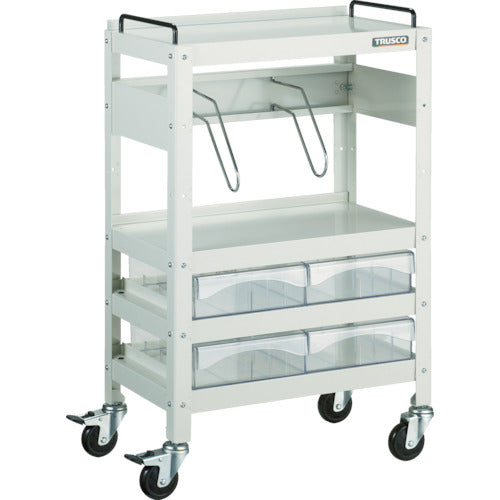 ●独自のエンボス加工で強度に優れたツールワゴンに便利なA4樹脂製引出しをセットしました。●車輪と共に車軸もロックするターンロック式ダブルストッパーです。●棚板の組付けは、内側にフランジ付ナットを使用しているため、外側から六角レンチで締め付けることで組み立てが可能です。