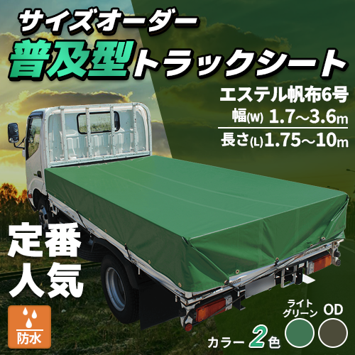 国産のエステル帆布6号を使用したトラックシートです。表面は程よい光沢があり、綿の帆布に似せた風合いで汎用的に使用されています。軽くて縮みにくく寒い時期に硬くなりにくいため、軽トラック~大型トラックまで幅広く対応可能です。カラーはライトグリーンとODの2色があります。