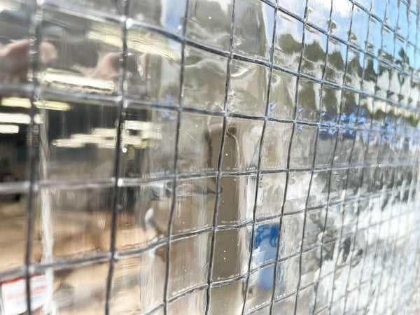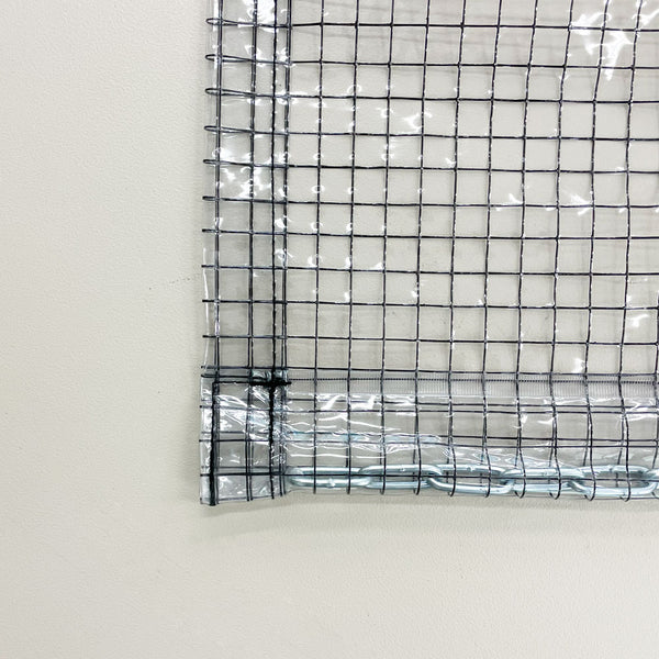 簡単シャッターカーテンには、優れた耐久性と視認性を確保するため、厚み0.3㎜、マス目15㎜の黒糸入り透明生地を採用しています。黒糸を使用することで、従来の白糸入り透明カーテンより視認性が向上し、落ち着いたアーバンな雰囲気を演出します。