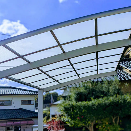 熱線カットポリカはヒートカット加工を施しており、熱線を約50%カットし、温度上昇を防ぎます。真夏の炎天下でも温度の上昇を抑えられるため、カーポートやテラスの屋根材としてオススメで目隠しとしてのご利用いただけます。