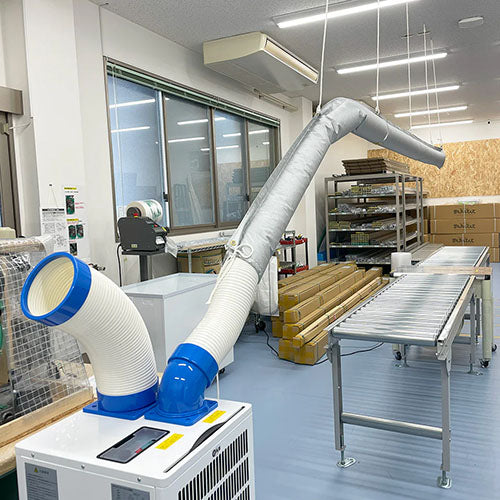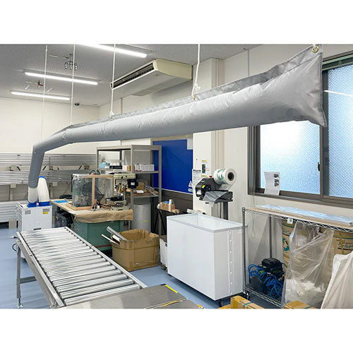 設置は非常に簡単で、スポットクーラーの送風ノズルに紐で固定し、ダクト本体を天井から吊るすだけ。工事不要で、即日運用が可能です。