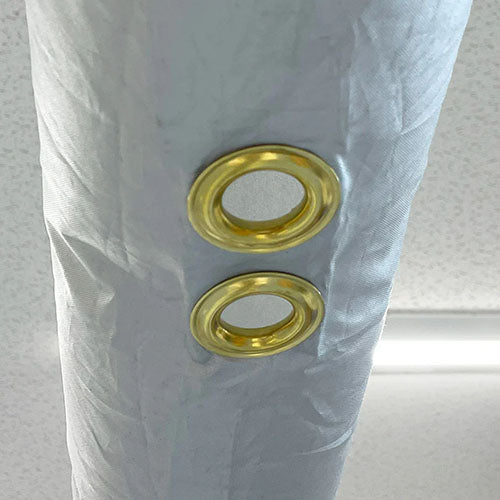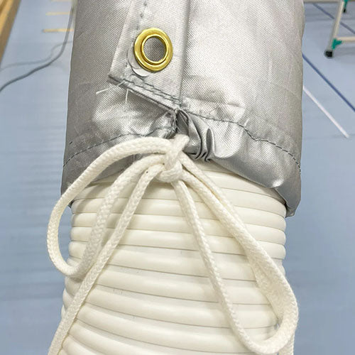 付属のビニロン紐や、お好みのフックなどで吊り下げるだけで簡単に設置可能。6箇所に吊り下げ用のハトメが施されています。 スポットクーラーとの接続は送風ダクトにかぶせてロープを絞るだけ。一般的なφ125口径のスポットクーラーに対応しています。(φ140未満に対応)