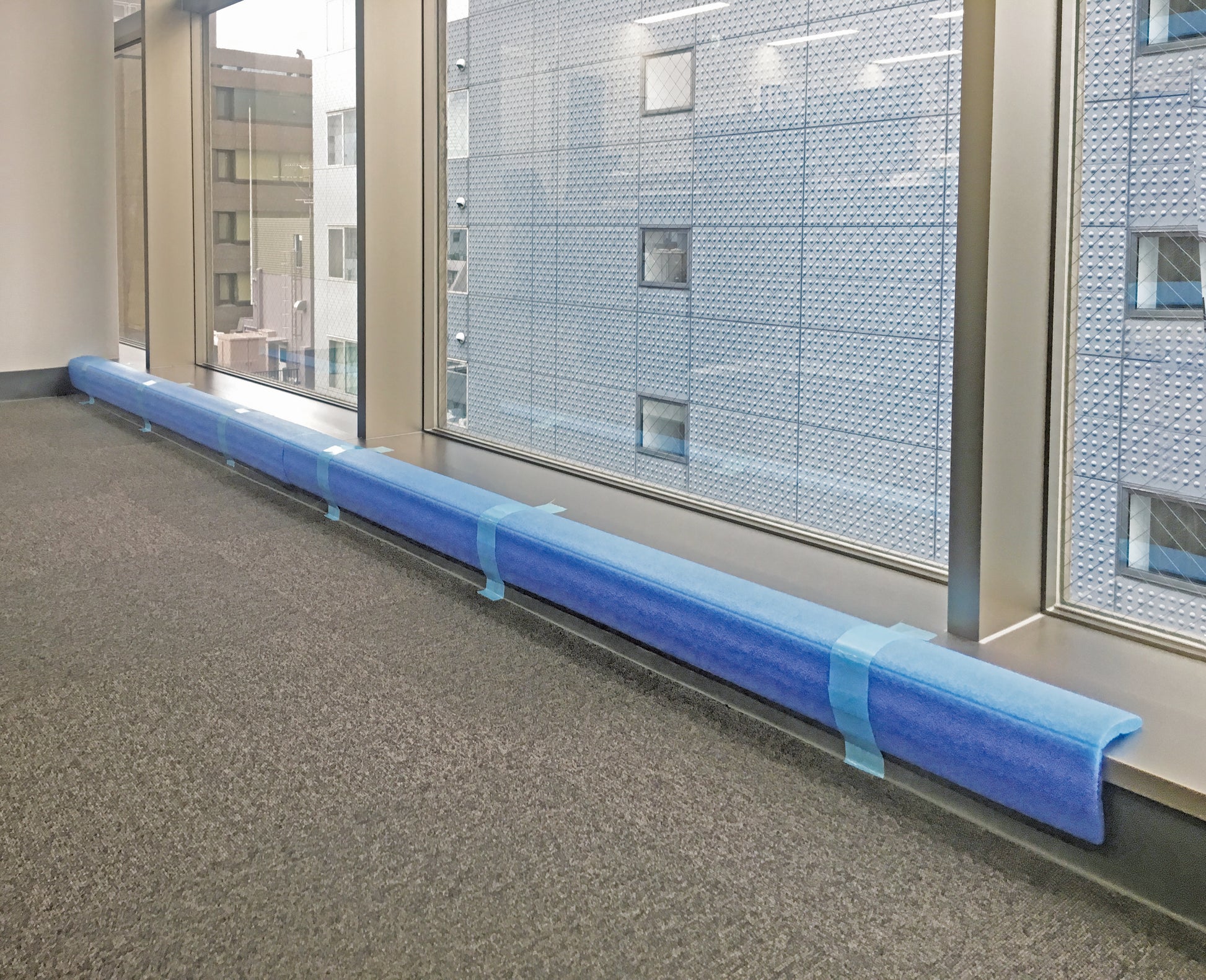 発泡ポリエチレン製のL型養生材です。出隅などの角部にもぴったりフィットし、さまざまな箇所の保護に最適。優れたクッション性と衝撃吸収性で、対象物をしっかり守ります。カッターで簡単にカットでき、幅方向の両端が細く設計されているため、施工時にテープでの固定がしやすく、扱いやすい形状です。