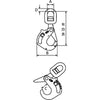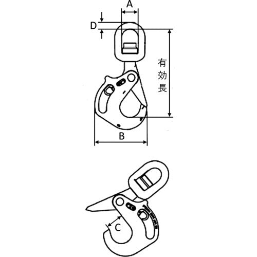 ●ラッチロックフックに持ち手が付いているため安全に作業ができます。●2ヶ所にクイックチェックが付いています。●クイックチェックはセンターより45度の場所に印が付いていて、吊角度が90度以内であることが一目でわかる印です。●ワイヤ、チェーンスリング用吊金具。●合金鋼