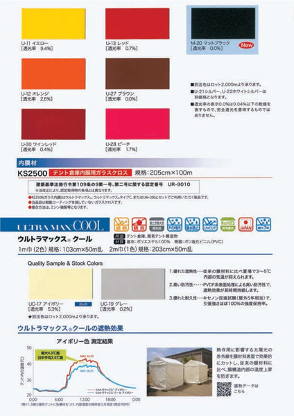 ウルトラマックスはテント倉庫や大型テント屋根等にも使用されている生地で、ターポリンと比較してもはるかに耐用年数が長く、様々な用途に使用可能。