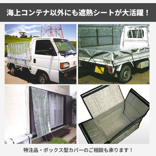 コンテナ内の温度上昇を抑えるためには、遮熱効果があるアルミを使用したシートをご利用ください。 大型サイズや特注仕様にも柔軟に対応しております。