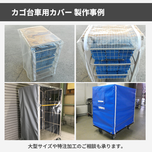 カゴ台車・パイプカーゴにおすすめ!理想の形にカスタマイズできる台車カバーです。日よけ雨除け・埃除けなどあらゆる用途にご使用いただけます。使用されているシートは、高い耐候性と防汚・防炎など多くの機能を兼ね備えたウルトラマックスです。