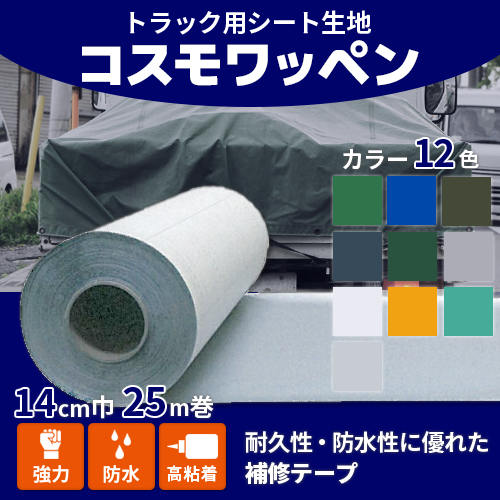 トラック用のシート生地を採用した高い強度と防水性を持つコスモワッペンは、トラックシートや、テント生地などで破れた箇所を簡単に補修できる強力ノリ付きの補修テープです。