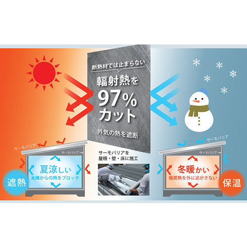 サーモバリアを屋根・壁・床に施工する事で、熱問題の原因である輻射熱を約97%カット!エアコンの冷暖房ががなかなか効かない、光熱費が高くなりがち、暑さや寒さで作業の効率が落ちる、体調を壊すといった暑さ寒さの問題を改善します。新築だけでなく既設の建物にも短期施工が可能です。
