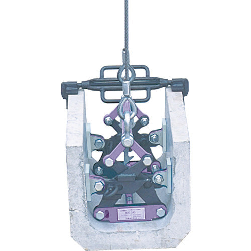 ●吊り具が道糸に接触せず、また側溝の外側に必要以上の空間が不要です。●特殊ゴムパッドにはスパイク機構を採用し、吊り荷を確実にクランプします。●吊具が道糸に接触せず、また側溝の外側に必要以上の空間が不要。●特殊ゴム製パッドにはスパイク機構を採用し、吊り荷を確実にクランプ。(無傷型としても使用可能。)●U字溝の内吊り作業。●JIS鉄筋コンクリートU形240、300A・B・C、JIS落蓋式U字溝250、300A、長さ2mまで。●情報ボックスU形専用吊クランプ。