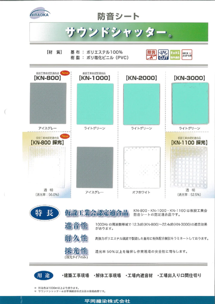 | 仮設工業会認定適合品 | KN-800・KN-1000・KN-1100は仮設工業会防音シートの認定適合品です。 |